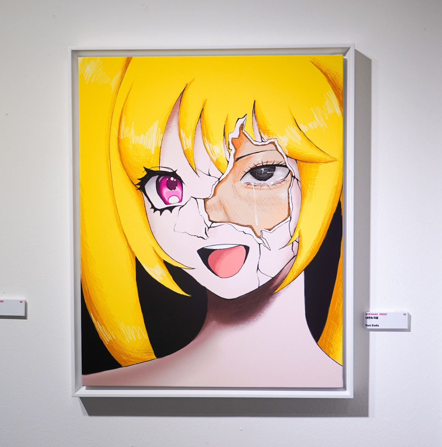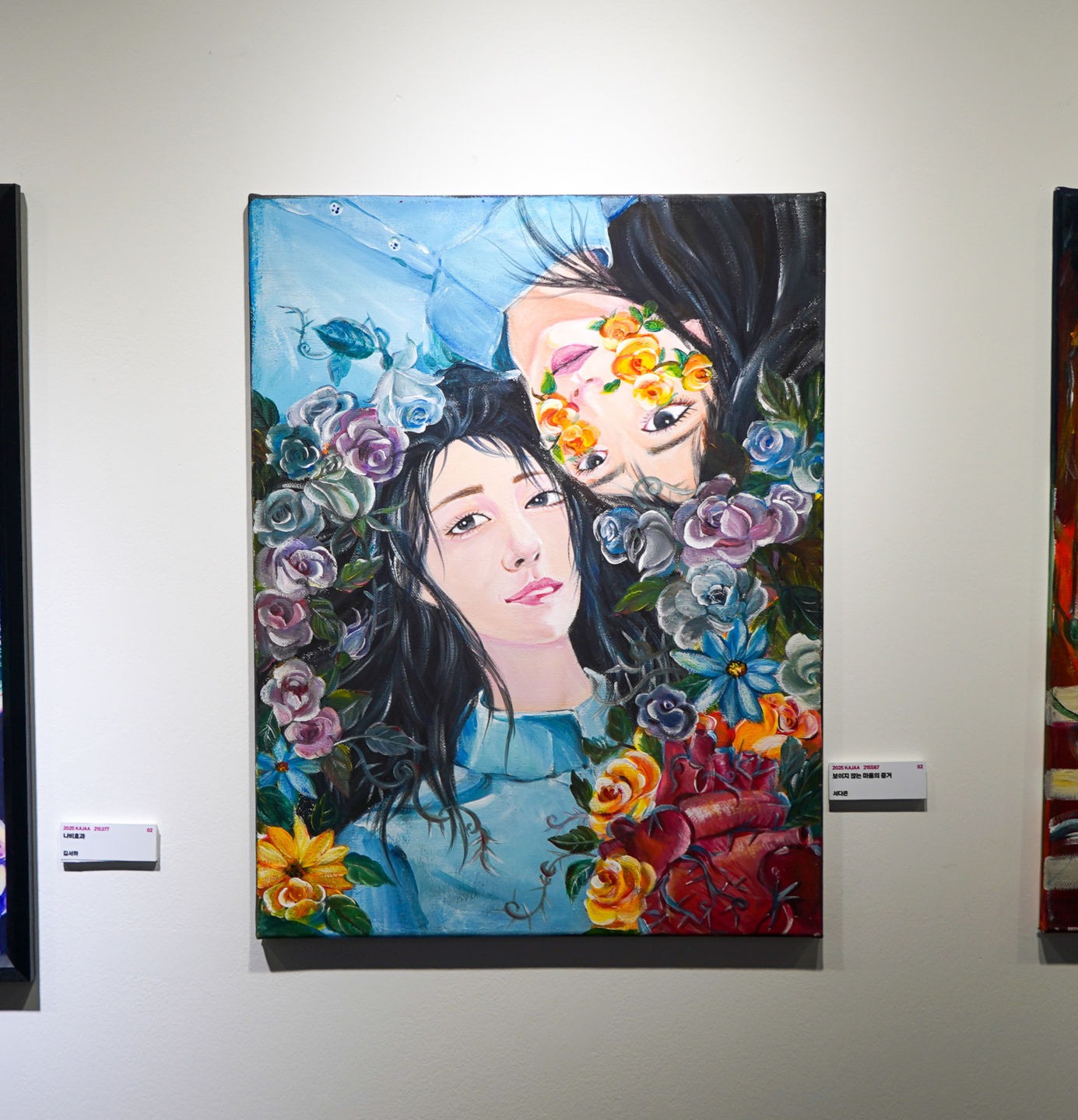 우리는 누구나 마음 한가운데 빠져 있는 퍼즐 한 조각을 안고 살아간다. 그 빈자리는 결핍이자상처이고 때로는 타인과 이어지기 위해 비워둔자리 라고도 생각 한다.이 그림속의 인물들은 서로를 마주 하지만 닿지못한다. 겉으로는 무표정한 모습 그 모습은 사회의기준 또는 타인의 정해놓는 기준 심지어 자신이 정해 놓는 기준 그것에 맞춰서 어렵게,또 외롭게살아가는 우리를 닮은 모습이다하지만 가슴 속에는 검은 퍼즐모양의 공허가 그려져있다. 그 공허에서 나온 마음의파동은 내면에서 찾아 나오는 마음에 떨림이자보이지 않는 곳에서 타인에게 전해지는 조용한 신호이다.퍼즐은 혼자서 완성되지 않는다. 내 안에 빈틈을 결국 타인 통해 채워진다 라고 생각한다. 그래서 우리는 서로의 결핍을마주 하고 때로는 맞춰 보고 때로는 어긋나며 그 과정을 통해 조금씩 살아간다. 그 배경을 가로지르는지 뒤엉킨 흰 선들과 알록달록한 희미한선들은연결의 과정이다 질서정연하지않고 때로는 옮기지만 결국은 우리 서로에게 닿게 하는 길이 된다. 또는 관계 형태 라고도 할 수 있다. 유연하면서도 딱딱하고 단순한것같으면서도 어려울 그런 모습을 담아 내고 싶었다. 이 그림은 마음에 전해지는 순간들을 그린 기록이다. 마음은 눈에 보이지 않지만 분명히 전해지고 채워진다.이그림은 누군가의 마음에 보이지 않는 곳에서 맞춰 주는 퍼즐이다. 그리고 지금 당신은 나와의 조각과 마주 하고 있다. 그리고 위로를 한마디 하고 싶다. 지금 당신의 빈자리가 언젠가 누군가의 퍼즐로 맞춰질 것이고 또 누군가의 빈자리가 당신으로 완성 될 것이라고 말하고 싶다. 그림을 보고 많은 위로를 얻어 갔으면 좋겠다.
