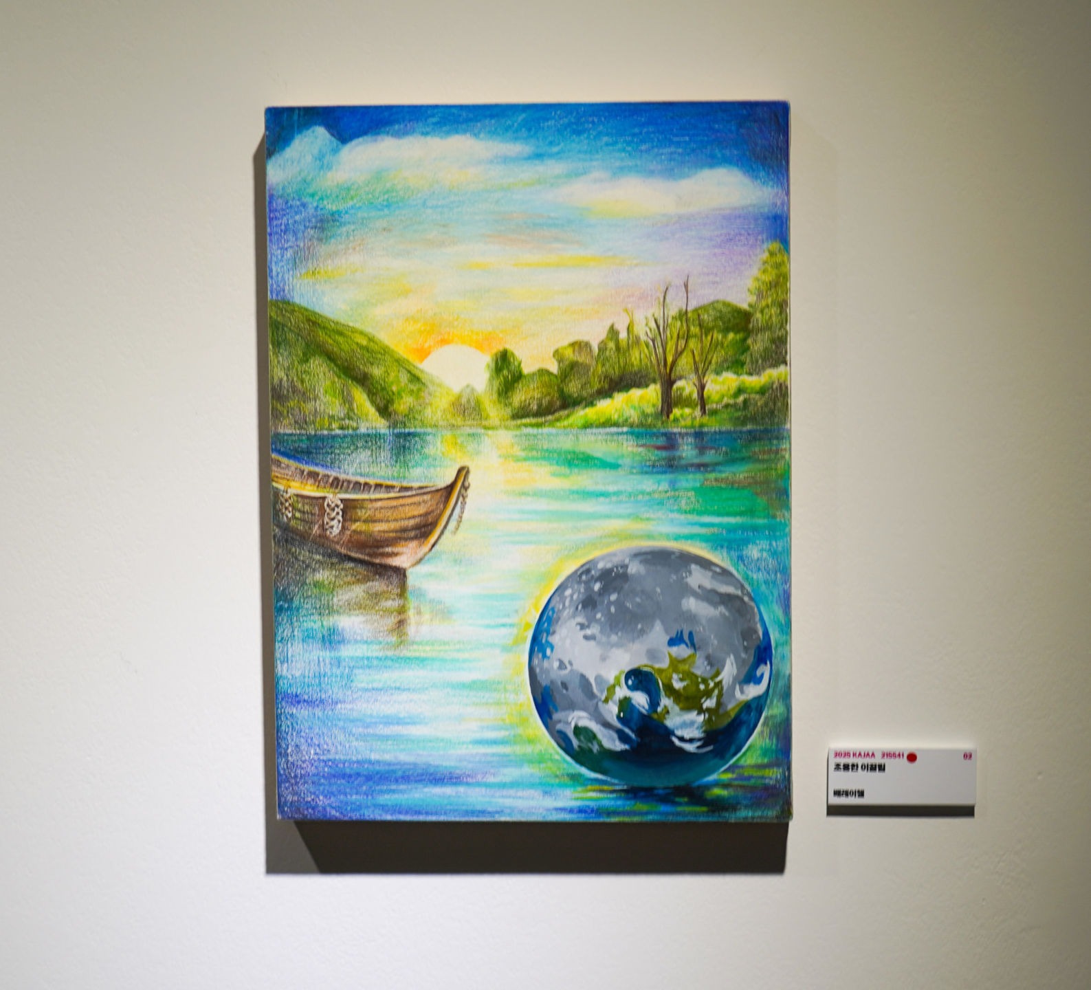 따뜻함이라는 감정을 생각해 볼 때 가장 먼저 머릿속에 떠오르는 것은 밝고 환하게 퍼지는 햇살이다. 이 햇살은 산과 호수, 고요히 떠 있는 나룻배, 그리고 지구와 달의 혼합체를 비추고 있다. 달은 어두운 밤하늘을 밝혀주며 우리에게 늘 위안과 고요함을 선사하는 존재이고, 지구는 수많은 사람들과 동물들, 그리고 다양한 생명이 살아 숨 쉬는 단 하나뿐인 소중한 공간이다. 그리고 나룻배는 이 중요한 달과 지구를 향해 조용하고 천천히 나아가고 있다. 이 작품에서 삶의 공간인 지구와 매일 만나지만 우리가 무심히 생각했던 달에게 좀 더 따뜻한 애정을 표현하고자 하였다.