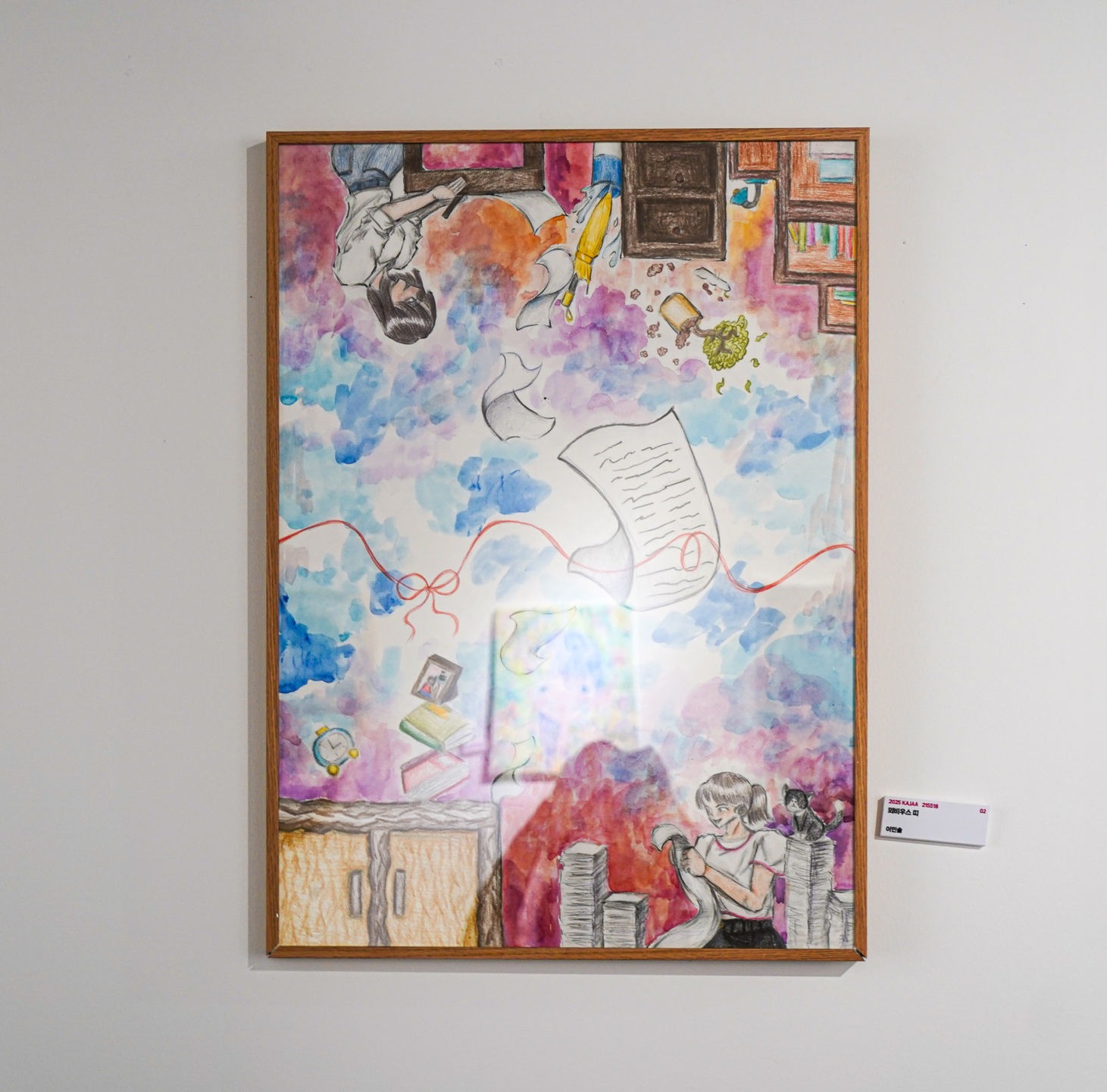과거의 내가 쌓아온 지나간 시간들이 현실의 내가 되고 편지와 기록 그리고 추억 또는 쌓여가는 생각들이 현실속의 나가 된다. 현실과는 다르게 뒤엉킨 기억 지나간 시간들은 과거의 나였을까? 두 세계를 연결하는 붉은 실은 운명적인 연결을 상징했고 리본으로 묶여 있는 것은 그 연결이 매우 단단하면서도 조심스럽게 유지되고 있음을 드러낸다. 몽환적인 배경을 그려내면서 전체적인 공간이 뒤섞여 있지만 그것이 뫼비우스 띠처럼 무한의 느낌을 줄 수 있도록 했다. 과거의 내가 지금의 나를 만드는 기억과 기록이 이어져 있음을 나타내고 싶었다.