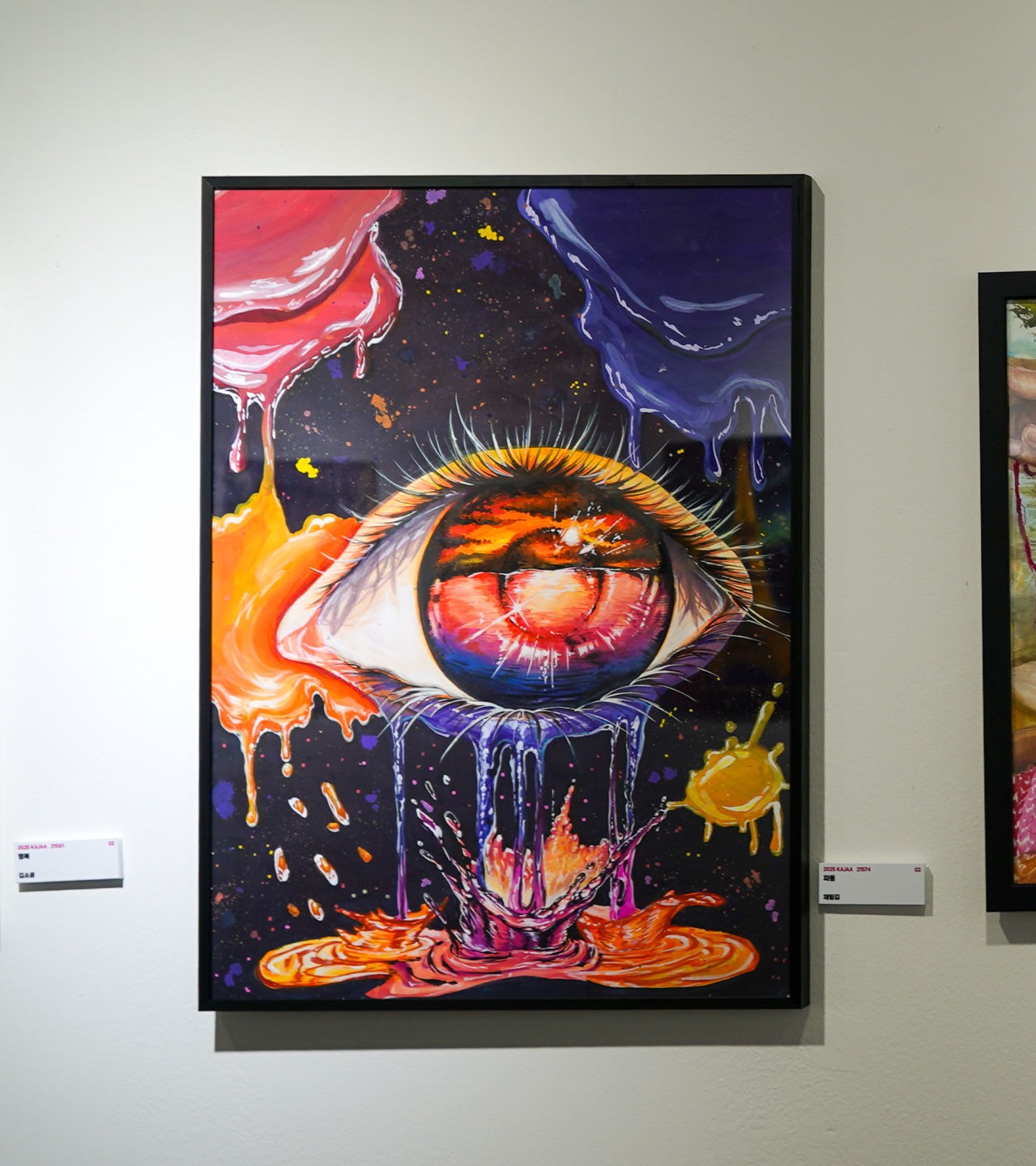 차갑고 어두운 어둠 속에서 슬퍼하다가 앞을 봤더니 자신의 넓었던 자유와 추억들이 빛나고 있었다. 자신의 과거를 회상하며 눈물이 났다 그러자, 차갑고 어두웠던 곳이 따뜻하고 밝은 색으로 물들어갔고 빛이 없던 눈은 아름다운 노을 빛의 바다로 빛났다. 그 한번의 눈물로,과거의 회상을 통해 마음속에 희망이 자랐다. 다시 그 어둠 속에 '빛'이라는 게 생겼다 보이지 않는 곳에서 전해진 마음은 때로 말보다 더 깊은 울림으로 다가온다. ‘눈’이라는 상징을 통해 시각화한 작품으로 눈동자는 자유를 비추는 거울이다. 멀리서 전해진 따뜻한 마음의 파동과 감정의 여운을 은유적으로 나타냈고, 물감이 튀는 듯한 표현을 통해 감정이 퍼져 나가는 흔들림과 울림을 표현하였다. 흐르는 눈물은 다양한 색의 물감처럼 번지고 흘러내리며, 복잡한 감정과 보이지 않는 감정을 시각적으로 풀어냈다. 단순한 하나의 감정이 아닌, 감사, 그리움, 공감, 위로 같은 다양한 감정의 스펙트럼을 색을 가진 물감으로 풀어냈다.