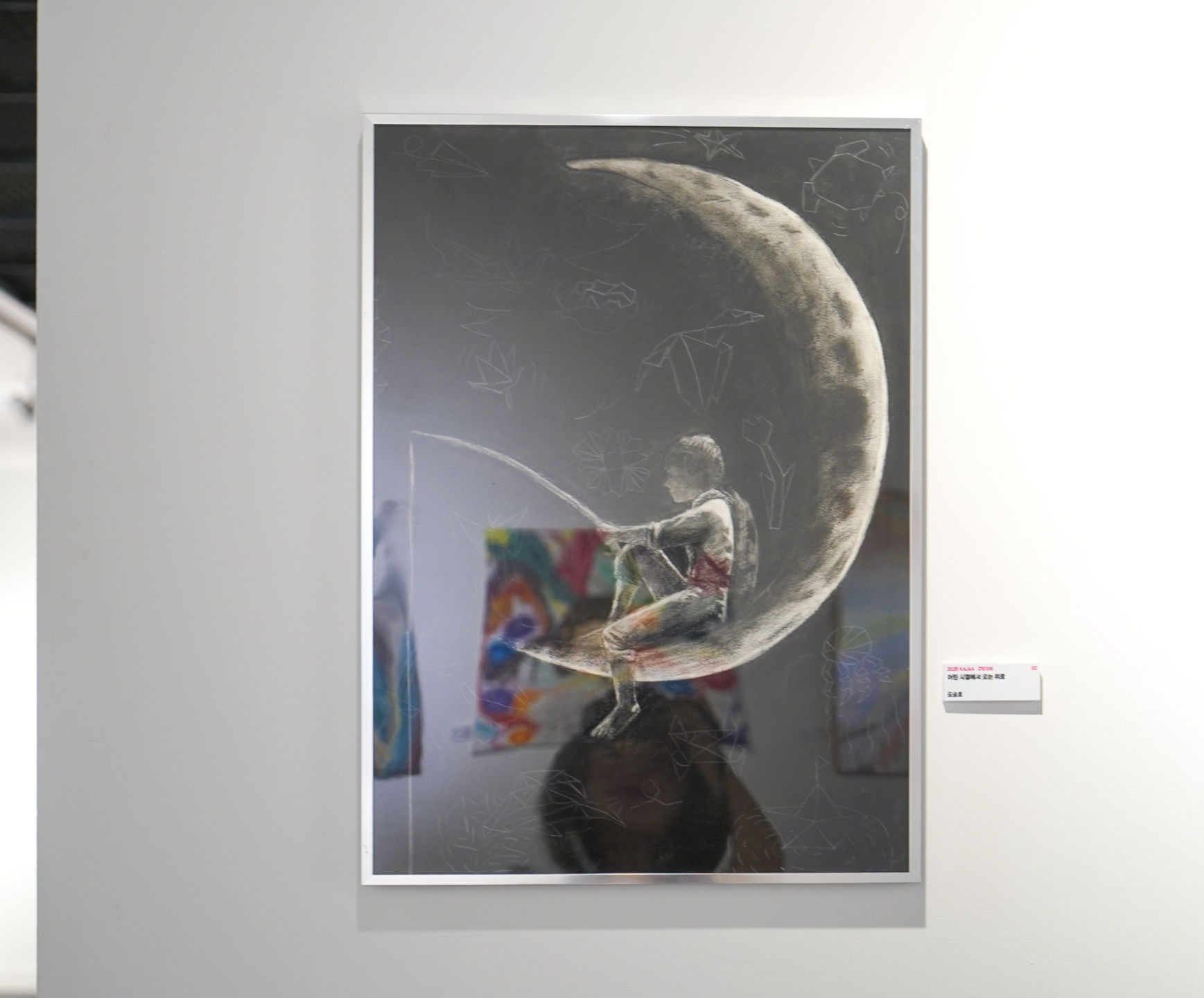 요즘 인생을 살다 보면 어린 시절이 정말 그리워지는 때가 오고는 합니다. 지금처럼 여러가지 걱정과 근심, 마음의 숙제와 같은 것도 없고 내일은 없는 것처럼 오직 행복을 위해 살아가는 그때의 모습이 부럽게 느껴집니다. 그래서 그때 그 순간으로 돌아가고 싶은 마음을 그림에 담게 되었습니다. 이 그림은 달과 그 위에 앉아있는 소년, 낚시, 종이 접기와 같은 요소로 이루어져 있습니다. 달은 이 공간이 넓은 우주임을 의미하며 이곳에는 아무것도 존재하지 않기에 근심이 생길만한 요소가 존재하지 않음을 의미합니다. 달 위에 앉아있는 사람은 바로 저 자신이고 뒤에 메고 있는 가방은 아직 제가 바쁜 학창 시절을 살아가고 있음을 의미합니다. 그리고 주인공(나 자신)이 낚시를 하고 있는데 낚시는 편안함과 여유로움을 상징합니다. 그래서 낚시를 하면서 여러가지 걱정을 잊어버리겠다는 의미를 담고 있고 있습니다. 그리고 주인공 주위를 떠다니는 종이로 만든 여러가지 물체들은 어린 시절의 행복과 자유를 상징합니다. 그 이유는 종이 접기는 어린 시절에 즐겨하는 것으로 종이 접기는 만들 수 있는 것이 무궁무진하므로 그런 자유로움에서 오는 행복이 이것을 상징한다고 볼 수 있습니다. 결국 이 그림은 현실에서 벗어나 어린 시절에서 오는 행복과 자유를 느끼고 근심과 걱정을 모두 날려버리고 싶다는 뜻을 담고 있습니다. 지금의 저는 현실에서 답을 찾으려고 합니다. 하지만 어린 시절로부터 오는 그리운 마음, 생각들과 옛날의 추억과 행복이 지금의 저를 위로하고 미래의 나를 위해 더욱 노력하는 원동력이 될 수 있는 계기가 되어 지금의 인생을 힘내며 살아갈 수 있다는 생각이 이번 그림을 계기로 생겼던 것 같습니다.