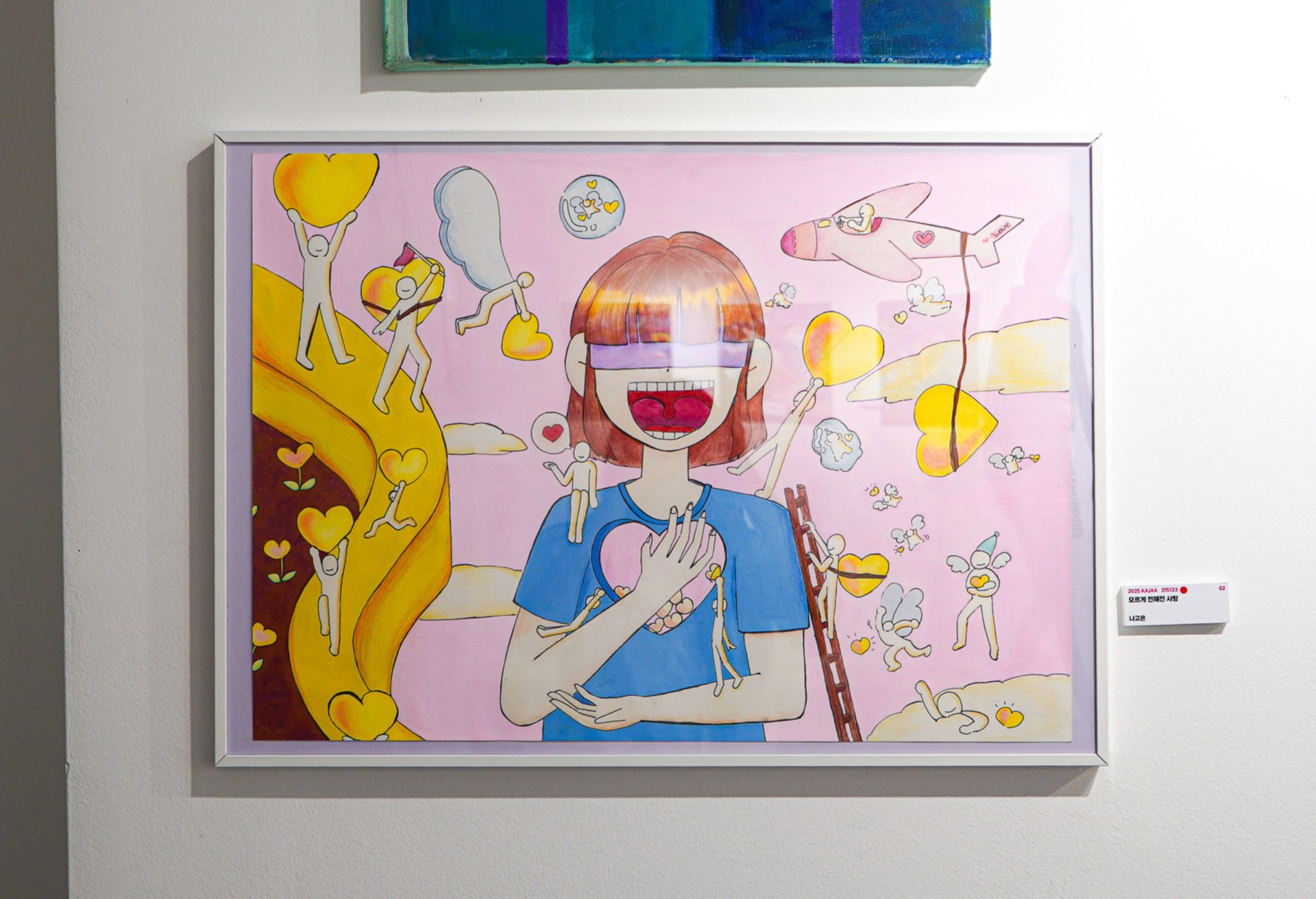 전체적으로 따뜻한 색깔을 넣어 따스한 분위기를 나타냈다. 주제인 한 소녀는 마음에 어떠한 아픈 마음의 흔적이 있는데 그걸 보라색 안대로 표현했다. 주위의 많은 관심과 사랑으로 마음이 점점 사랑으로 차고있고, 치유되는걸 표현하고자, 아픔이라 하면 생각나는 색깔인 파랑과 치유, 치료를 하면 생각나는 색깔인 빨강을 섞어 치유되는 중이라는걸 안대의 색깔로 나타냈다. 안대를 쓰고, 주위의 무언가들이 나 모르게 도와주고 마음이 회복되는것을 나타낸 그림이다. 그리고 크고, 작은 하트들이 어떤 사람이나 무언가에 의해 다양한 방법으로 다양한 형태로 나에게 위로나, 응원이 될수 있다는걸 표현했다. 마지막으로 무언가들이 자신을 위해 작고, 큰 마음을 자신의 마음에 보태어 준것에 대해 감사를 느끼듯 환하게 웃는 소녀를 그
