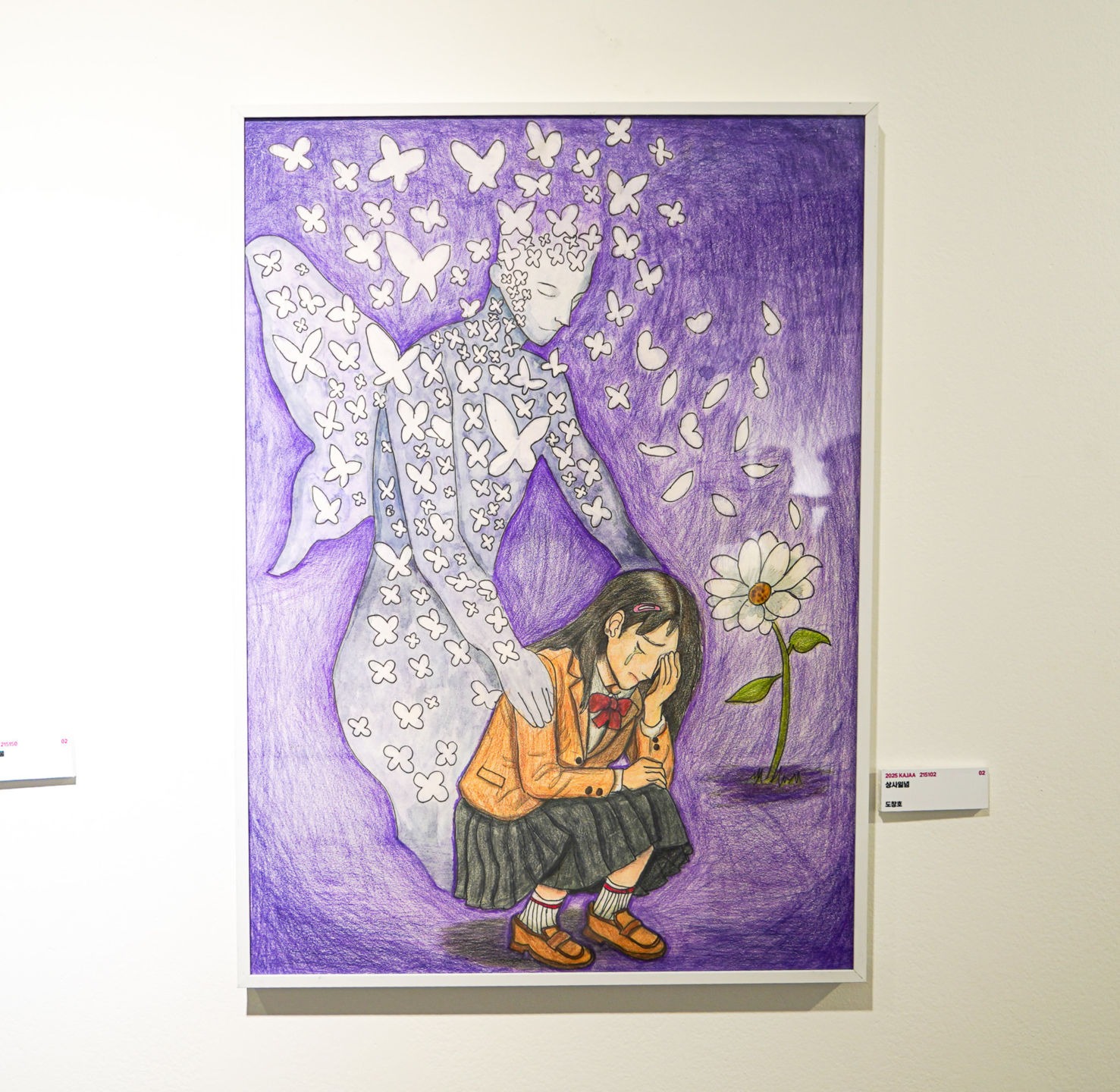 예전에 나는 세월호 참사에 관련된 프로그램을 본적이 있다. 프로그램에서 나오는 사람들 중에서는 참사로 소중한 이들을 잃은 사람들도 있었다. 나는 프로그램을 보고 너무 슬펐고, 그 감정을 그림으로 나타내어 보았다. 그림에서는 한 여자가 죽은 남자친구를 그리워하며 눈물을 흘리고 있다. 그 뒤에는 꽃잎이 나비가 되어 나비들로 이루어진 투명한 형체가 조용히 어깨에 손을 얹고 있는다. 이 형체는 남자친구의 영혼을 상징하여 여전히 여자의 곁에 머물러있음을 나타낸다. 나는 그리움을 상징하는 꽃잎이 영혼을 상징하는 나비가 되어 남자친구의 형상을 이루도록 구성했고 꽃잎들의 시작점인 꽃은 그리움이라는 감정을 남게 해주는 사랑과 추억을 상징한다. 이를 통해 나는 육체는 사라져도 사랑하는 사람이라는 존재는 느껴지지 않아도, 보이지 않아도 우리가 기억하는 한 언제나 마음속에 살아있다는 것을 말하고 싶었다.