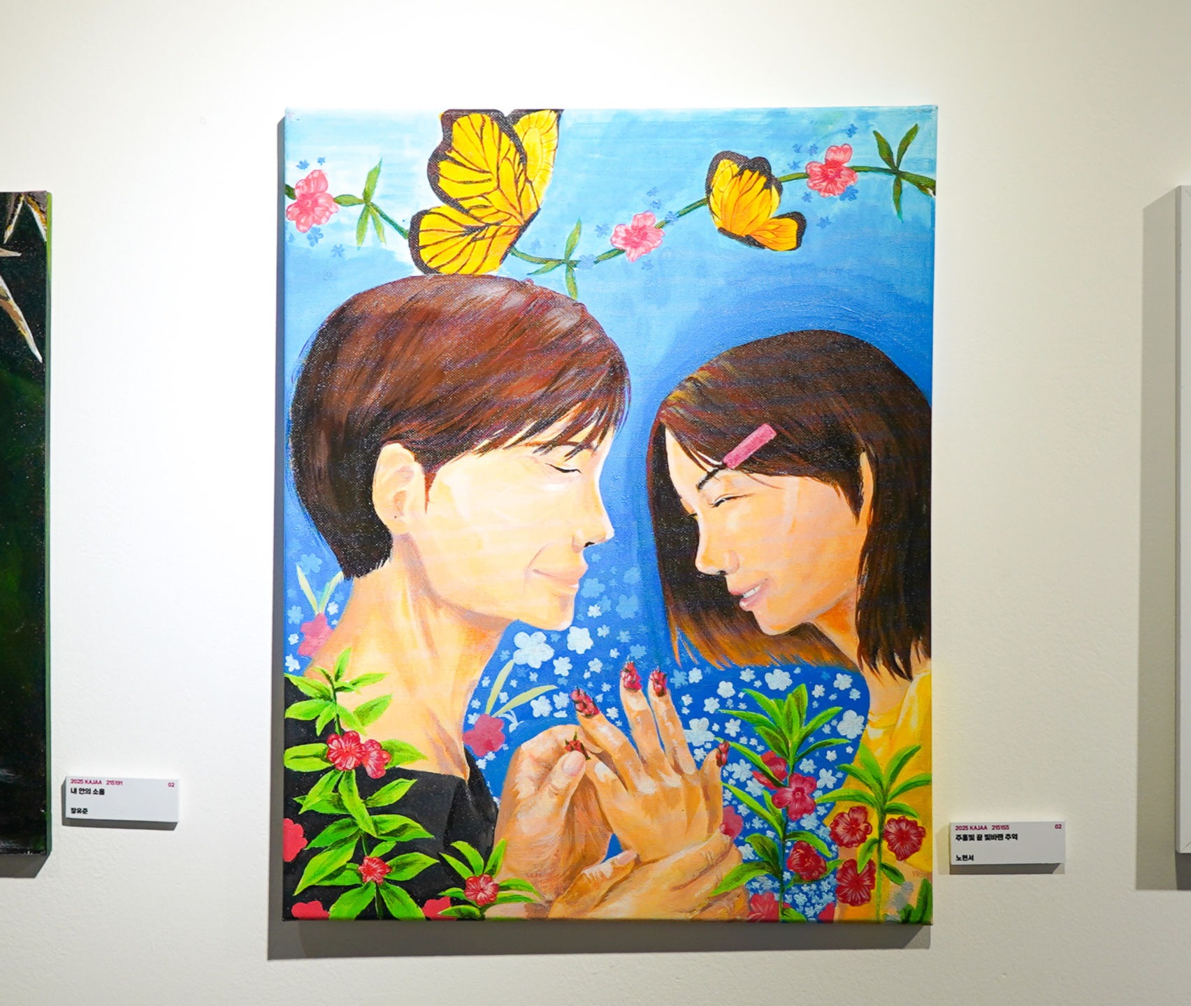 이 작품은 소녀의 마음속 감정이 나비와 붉은 끈을 통해 전달되는 순간을 섬세하게 표현한 그림입니다.