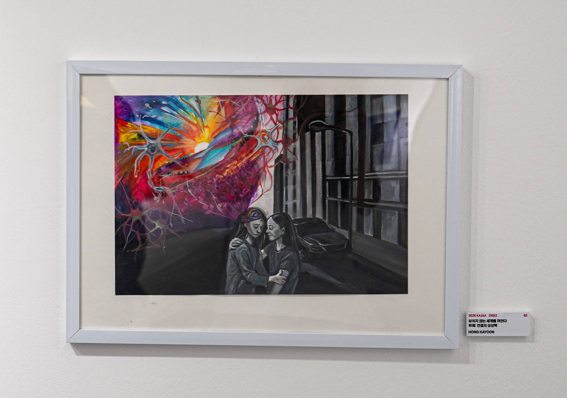 우리는 눈에 보이는 것들고 세상을 판단하려 합니다 외모, 성적, 말투, 성격 .... “ 그 모든 것 뒤에 숨은 진짜 세계를, 당신은 보려고 한적이 있나요?” 두 청소년 사이의 조용하지만 강렬한 연결을 보여주며 도시의 잿빛 현실속, 서로를 껴안은 두 인물은 같지만 그들의 머릿속에는 빛과색, 감정과 상상이 넘실거리며 화려한 뉴런과 뇌풍경은 서로의 감정을 시각화 했습니다. 청소년기의 감정의 혼란속에 친구의 작은 눈빛 변화, 말투속 감정, 문득 찾아오는 외로움이나 설명되지 않는 분노등의 감정까지... 이시대의 청소년들은 감정의 언어를 섬세하게 읽고 표현하고 싶어하는 존재입니다. “ 감정은 보이지 않아도 존재하고 , 연결은 말하지 않아도 이루어진다” 어른들의 언어로는 설명할 수 없는 감각으로 이루어진 청소년기의 보이지 않는 세계를 위한 연대의 메시지를 감정의 언어인 색으로 표현하여 전달하고자 합니다.