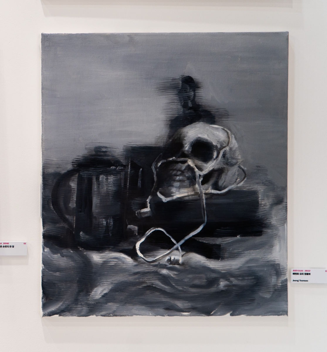 흑백으로 흐릿하게 표현된 해골과 책, 이어폰은 삶과 죽음, 기억과 소멸의 경계를 암시한다. 분명히 존재하지만 초점 밖에 놓인 사물들을 통해, 사라진 것들이 여전히 우리 곁에 남겨놓은 마음을 조용히 전한다.