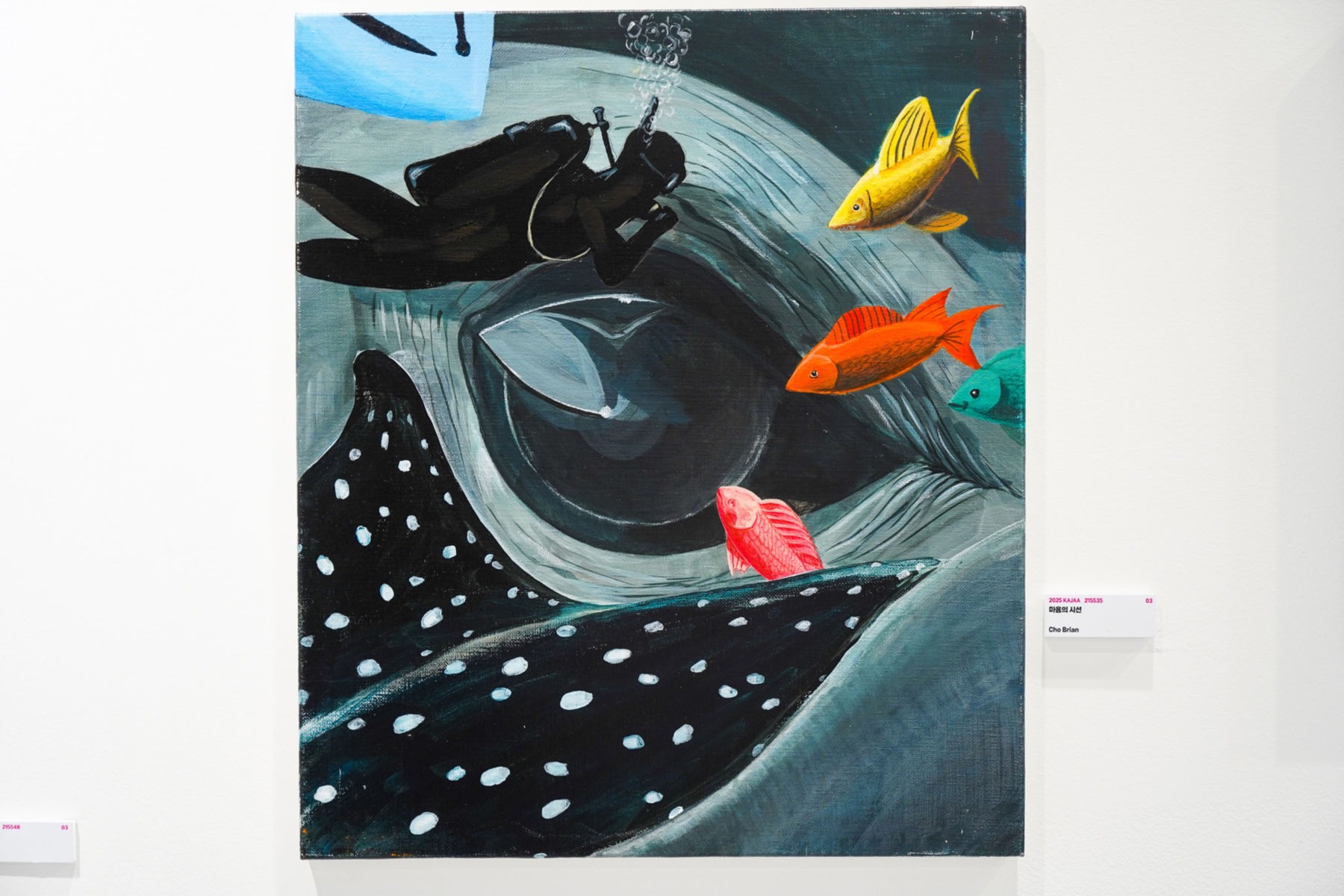 이 작품은 보이지 않는 감정과 교감을 깊은 바닷속 풍경으로 은유한 표현입니다. 중심에는 거대한 고래의 눈이 자리 잡고 있으며, 그 눈은 조용하지만 강한 감정을 담고 있습니다. 고래의 눈 옆에는 잠수부가 조용히 그 시선을 바라보며 마음을 나누는 모습을 그렸습니다. 주변을 헤엄치는 다양한 색의 물고기들과 가오리는 서로 다른 감정과 기억을 상징하며 이 장면에 따뜻함을 더합니다.