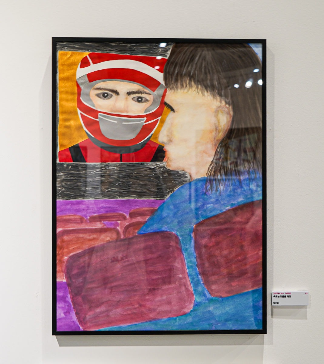 고등학교 3학년이 되어 진로와 학업에 대한 고민이 깊어지면서, 무더운 여름날의 무기력함까지 더해져 마음이 많이 지쳐 있었습니다. 공부에 집중이 잘 되지 않고, 앞으로 나아가야 할 방향이 흐릿하게 느껴져 머리를 식힐 겸 영화 「F1: 더 무비」를 보게 되었습니다. 스크린 속 F1 드라이버들은 극한의 속도 속에서도 끝까지 집중하며 달리고 있었고, 그 눈빛과 긴장감은 말없이도 진심이 전해지는 듯했습니다. 그 순간, 저도 다시 제가 이루고 싶은 목표를 향해 힘을 내고 싶다는 마음이 생겼습니다. 이 그림은 그런 마음에서 시작되었습니다. 말 한마디 없었지만, 화면 너머 인물의 태도와 시선이 나에게 전한 감정,그 보이지 않지만 분명히 존재했던 마음의 울림을 표현하고 싶었습니다.