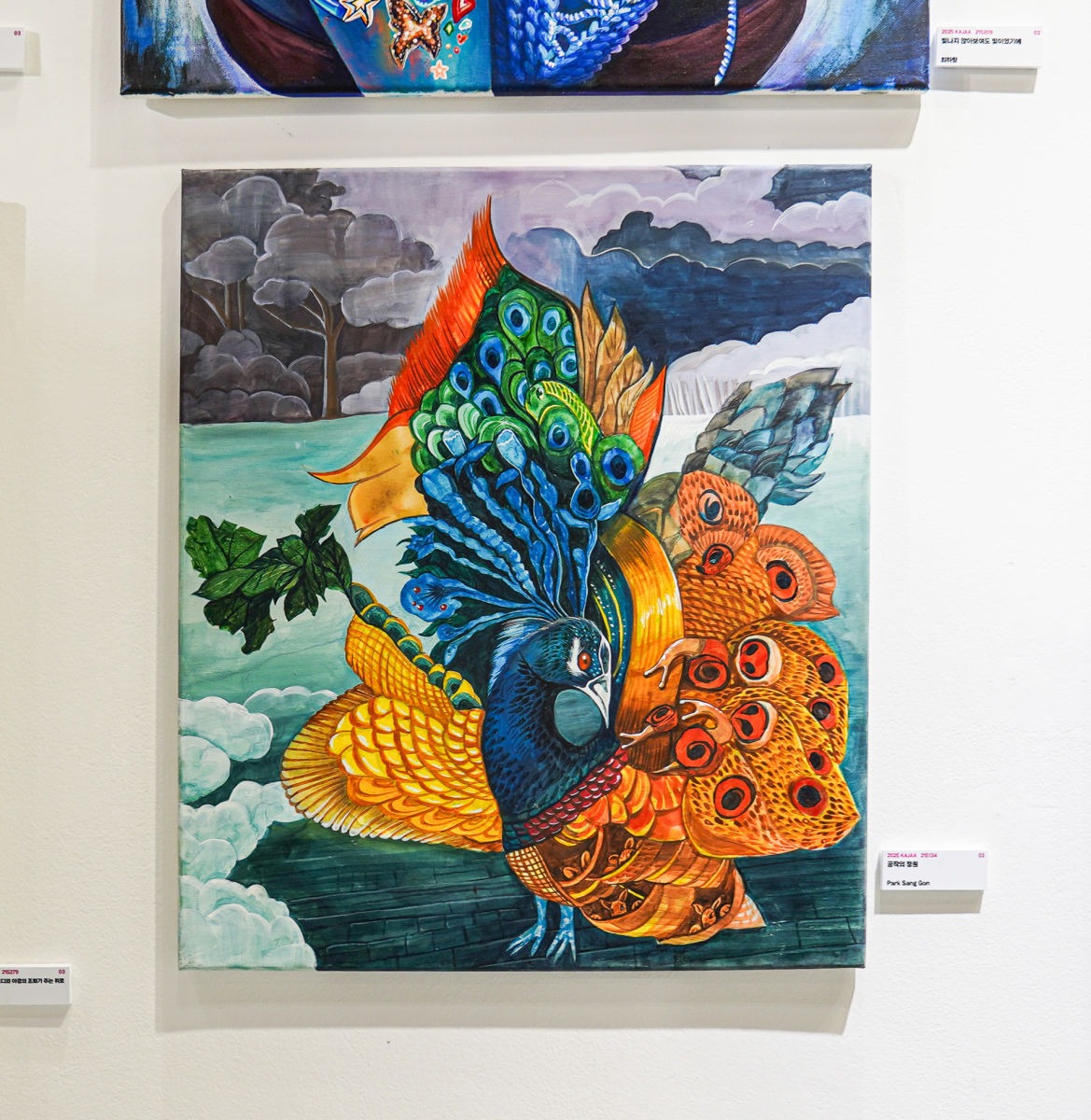 그래서 저는 공작을 중심으로, 그 깃털 속에 다양한 동물들을 조용히 숨겨 넣어 하나의 정원을 만들었습니다. 공작의 깃털을 자세히 들여다보면, 처음에는 보이지 않던 생명들이 조금씩 눈에 들어옵니다. 그것은 우리가 삶 속에서 쉽게 지나치는 자연의 조화로운 아름다움과 닮아 있습니다.