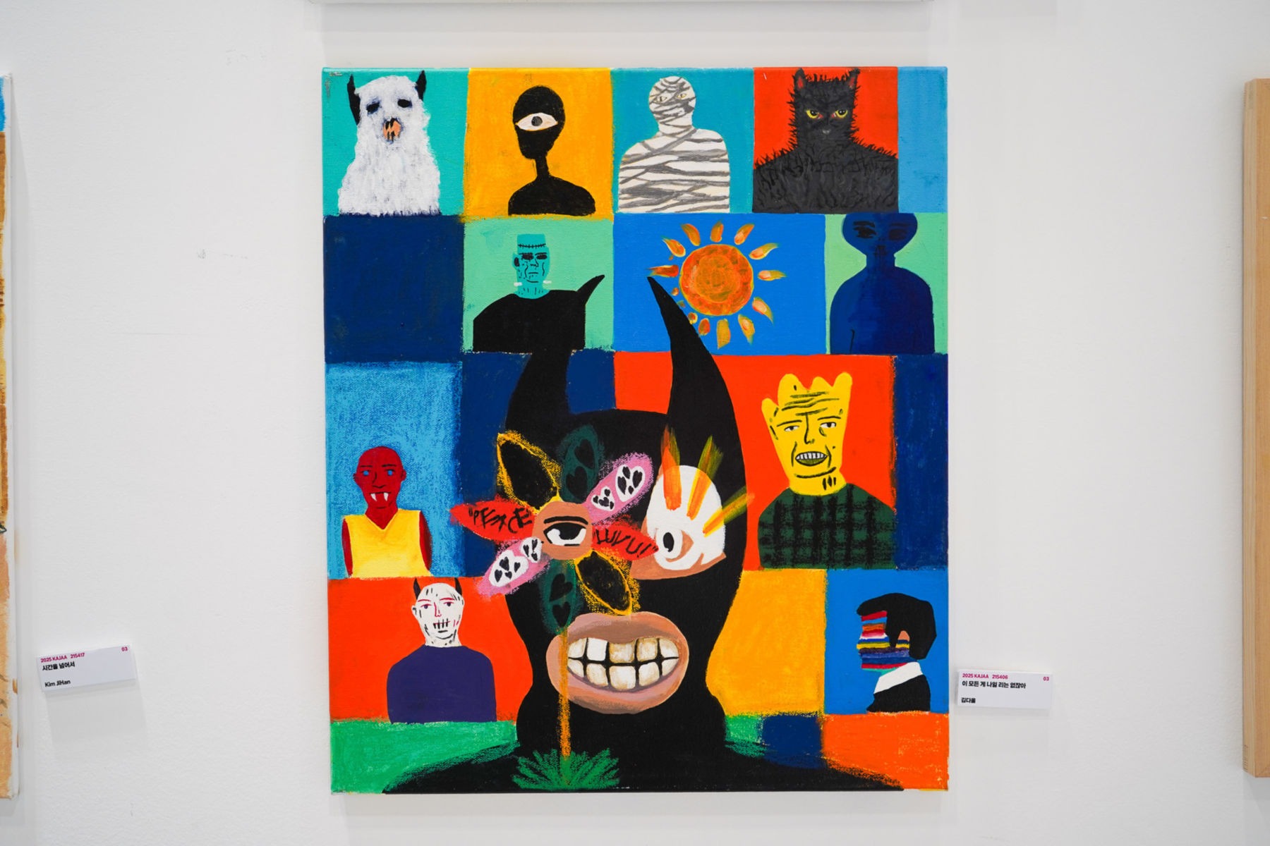 이 작품은 한 인간이 가지는 수많은 자아, 감정, 기억, 그리고 외부의 시선들이 얽혀 만들어지는 복합적인 정체성을 주제로 한다. 화면을 채운 다양한 인물들은 괴물, 인간, 가면을 쓴 존재, 기괴한 형상 등으로 표현되어 있다. 이들은 모두 서로 다른 표정과 분위기를 지니고 있지만, 동시에 한 사람의 내면을 이루는 조각들이기도 하다. 중앙에 위치한 인물은 과장된 이목구비, 부자연스럽게 겹쳐진 눈과 입, 찢어진 듯한 표정으로 표현되어 있다. 그의 얼굴은 일관된 자아가 아닌 해체된 감정의 조각들로 재구성된 모습이다. 꽃처럼 퍼져 있는 시선, 겹겹이 쌓인 감각은 혼란과 과잉을 상징하며, 정체성을 단일한 ‘나’로 설명하기 어렵다는 메시지를 던진다. 이 인물을 둘러싼 배경은 여러 색으로 나뉜 격자 형태인데 이는 외부로부터 주어진 다양한 사회적 정체성, 역할, 혹은 타인의 시선을 상징한다. 우리는 누군가의 친구이고, 자식이고, 학생이며, 때론 괴물로, 때론 피해자로, 때론 가해자로 살아간다. 그 모든 역할과 이름들이 한 사람에게 얽히며, 결국 혼란과 질문을 남긴다. "이 모든 게 나일 리는 없잖아”라는 제목은, 자신을 구성하고 있다고 여겨지는 요소들 앞에서 느끼는 부정과 의문을 담고 있다. 이 얼굴들이 모두 나일 수는 없다고 생각하지만, 어쩌면 그 모든 것이 ‘나’일 수밖에 없는 시대 속 인간의 정체성에 대한 아이러니를 표현했다.