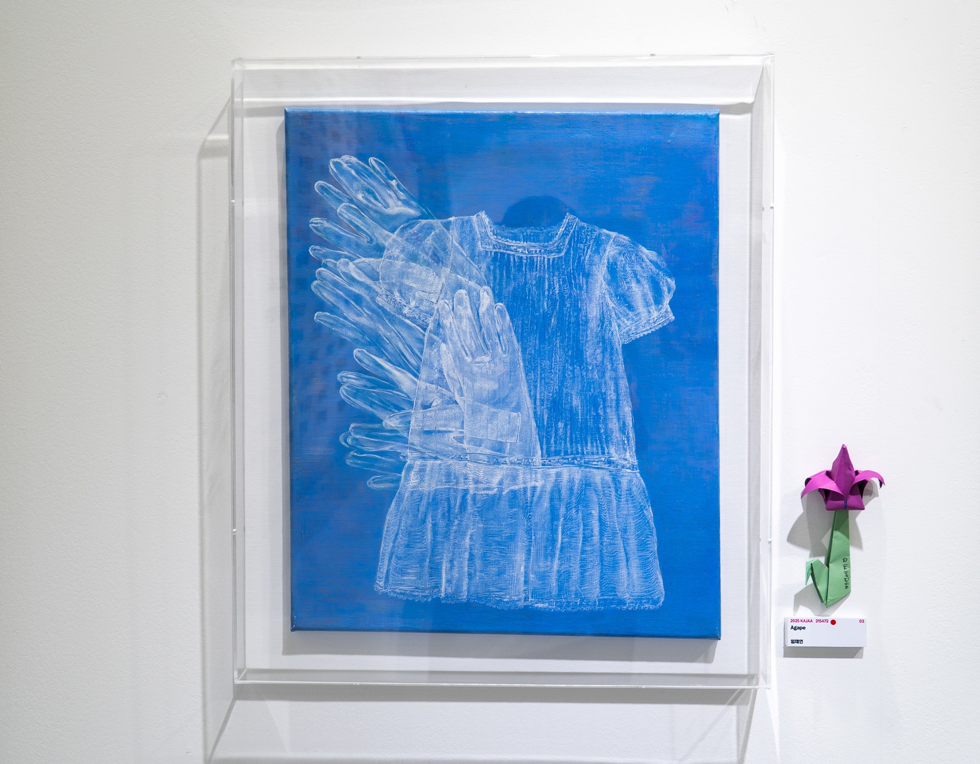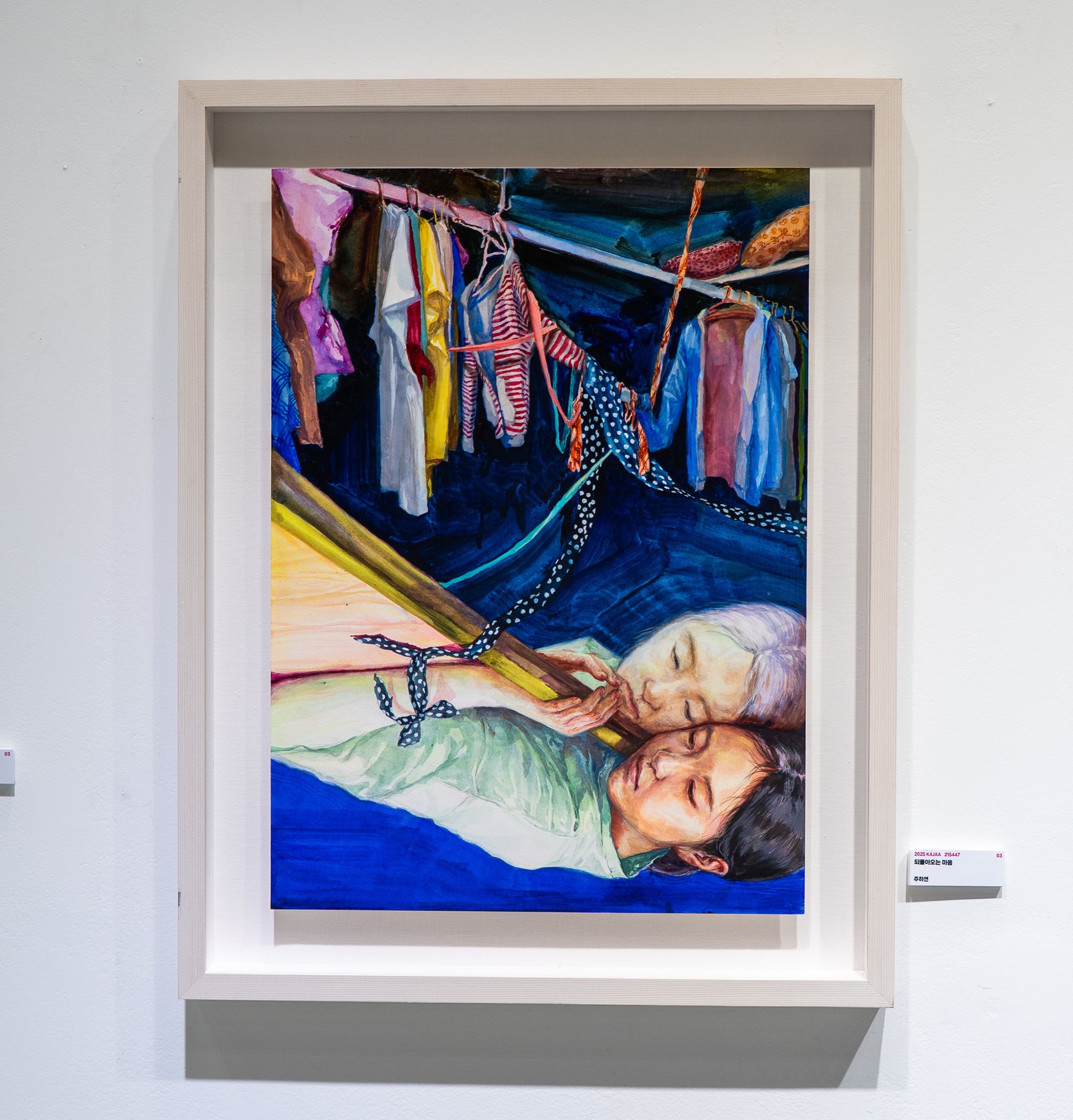 이 작품은 할머니에서 어머니를 거쳐 나에게 이어져 온 모성애의 계보를 시각적으로 기록하고자 한 시도이다. 나는 한올 한올 정성스레 떠진 옷을 다시 그림으로 필사하듯 재현하는 방식을 통해, 보이지 않는 헌신과 희생을 형상화하였다. 밝은 배경 위에 놓인 옷은 단순해 보이지만, 세밀히 들여다보면 수없이 겹쳐진 붓질과 선이 쌓이고 쌓인 오랜시간의 정성이 스며 있다. 이는 마치 실제 손으로 짠 옷 속에 스며 있는 사랑과 노고처럼, 시각적으로는 미세하나 감각적으로는 깊이 있는 표현이다. 작업에는 캔버스에 유화를 기본으로, 미세한 결을 살리기 위해 흰색 펜과 연필을 병용하였다. 이를 통해 실제 옷의 질감과 손의 노동을 느낄 수 있는 시각적 경험을 구현하였다.