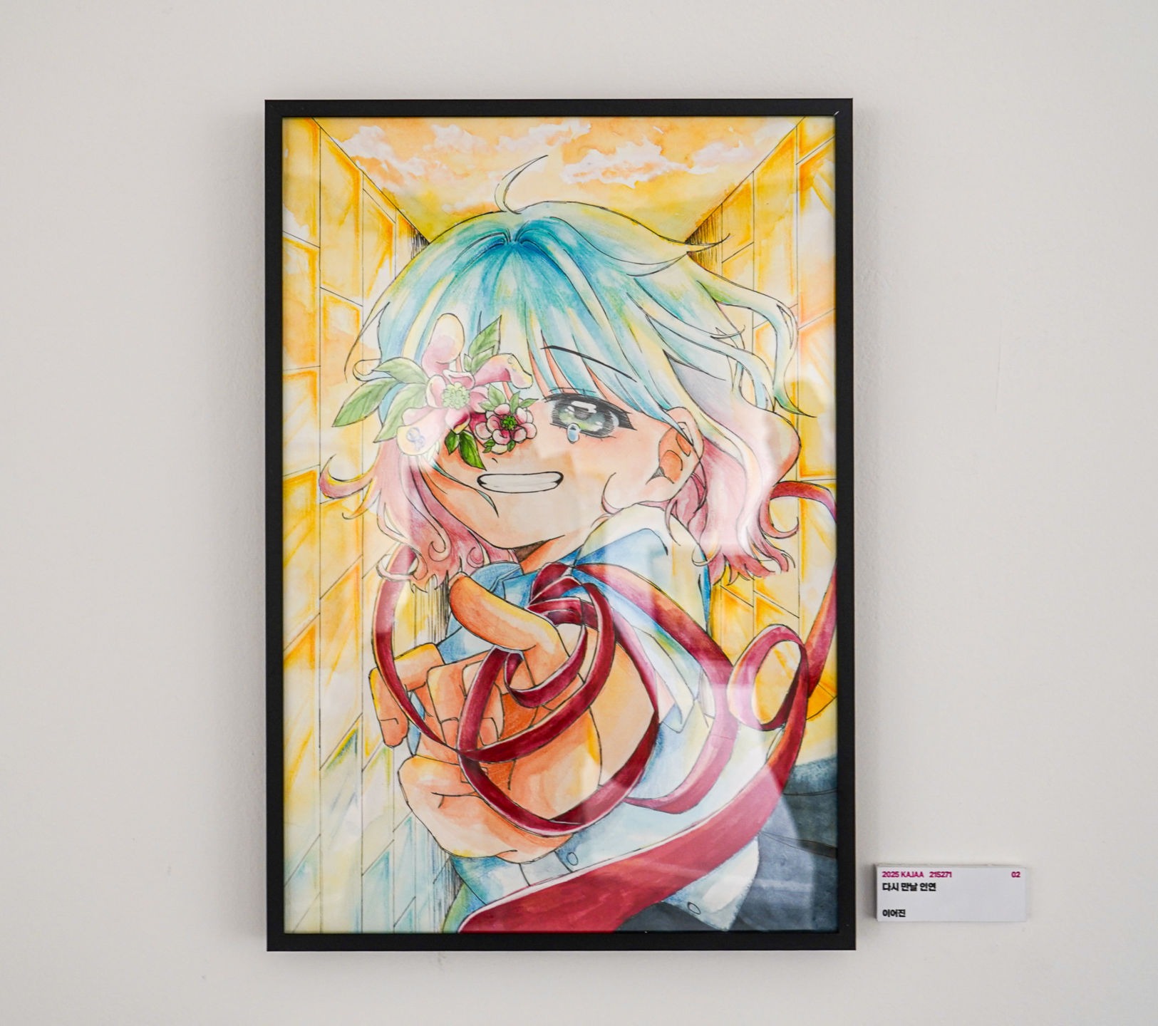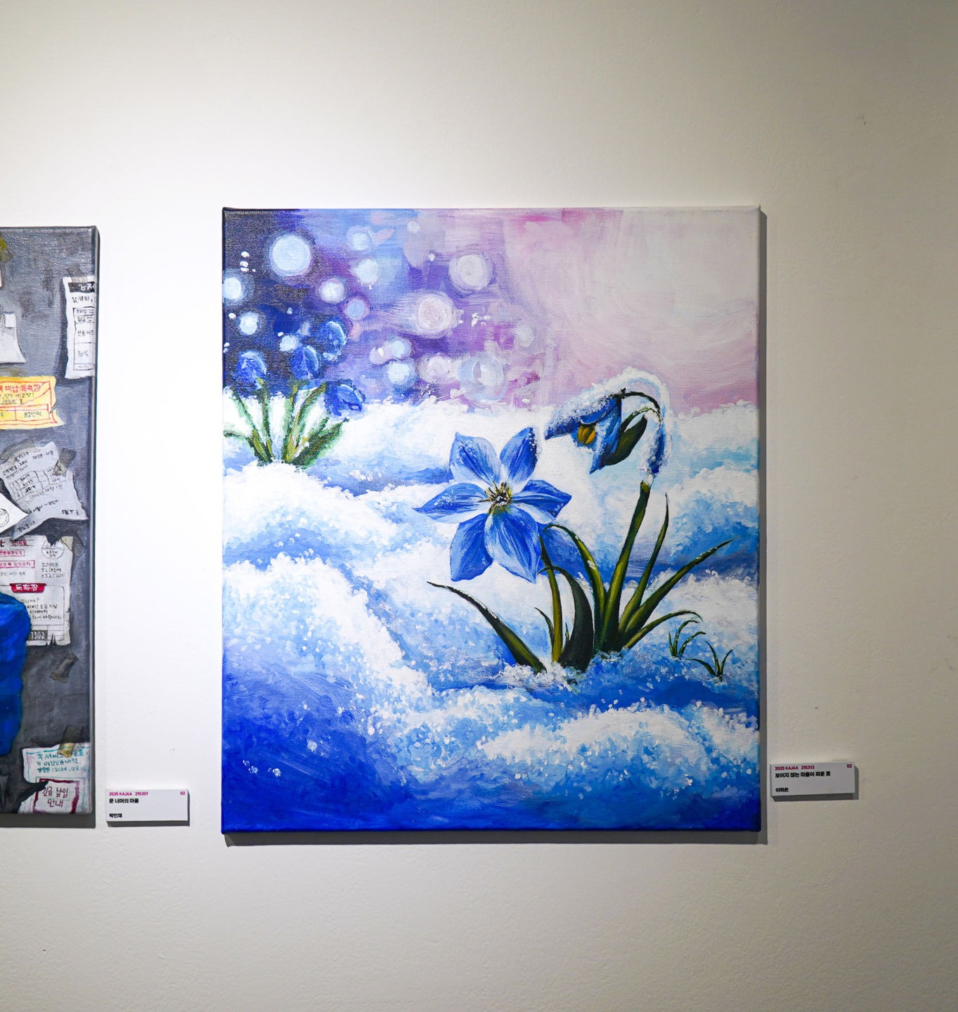햇빛을 받아 긴 겨울 끝에 피어난 푸른 꽃을 그렸습니다. 푸른 꽃은 사람의 마음을, 햇빛은 보이지 않는 곳에서 전해지는 위로와 칭찬, 돌봄 같은 따뜻한 마음을 상징합니다. 햇빛은 눈에 잘 띄지 않지만, 그 따스함은 우리의 마음 깊은 곳에 닿아 차가운 시간을 지나 다시 피어날 수 있는 힘이 됩니다. 이 작품은 형태는 없지만 분명히 존재하는 마음이 전해지는 순간을, 꽃이 피어나는 장면을 통해 시각화한 것입니다. 때로는 조용히 스며드는 햇빛처럼, 마음도 그렇게 전해집니다.