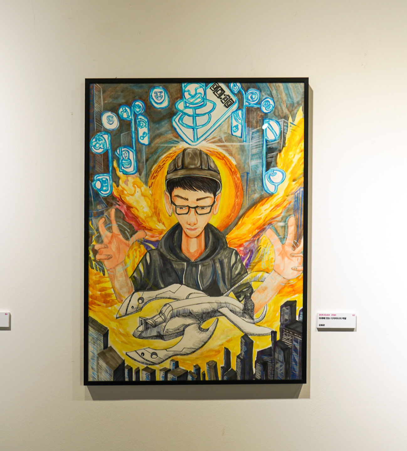 이 작품은 점점 변화하는 미래 사회 속에서 디자이너가 미래 사회 속에 기술적인 요소와 디자이너가 가지고 있는 감성으로 미래에 새로운 역할을 하는 디자이너를 표현하였습니다. 그림 속에 있는 사람은 미래에 기술이 탑제되있는 물체와 디지털 오브젝트 등을 다루고 있으며 이는 미래사회에 있는 정보 등이 디자이너가 시각 언어를 통해 다른 나라들의 사람과 사람, 문화와 문화 그리고 감성과 기술을 연결해주는 존재임을 상징합니다. 소년을 주변으로 다양한 아이콘과 오브젝트들은 미래 사회가 되면서 복잡해지는 그 시대에 데이터를 의미하며, 디자이너가 이를 재구성해 다른 나라들의 공감과 소통이 가능해지는 형태를 전달합니다. 특히 중앙에 있는 사람의 제스쳐와 표정은 디자이너의 보이지않는 마음, 공감, 상상력이 디자이너의 핵심 도구임을 의미합니다. 이 작품은 `디자인은 단순히 만드는 일이 아닌 전달하는 일이다`라는 메세지를 담고 있으며 미래에는 디자이너가 사람과 사람 간의 문화와 감정을 이어주는 중재자로서 미래 사회 안에서 중요한 역할을 할것입니다.