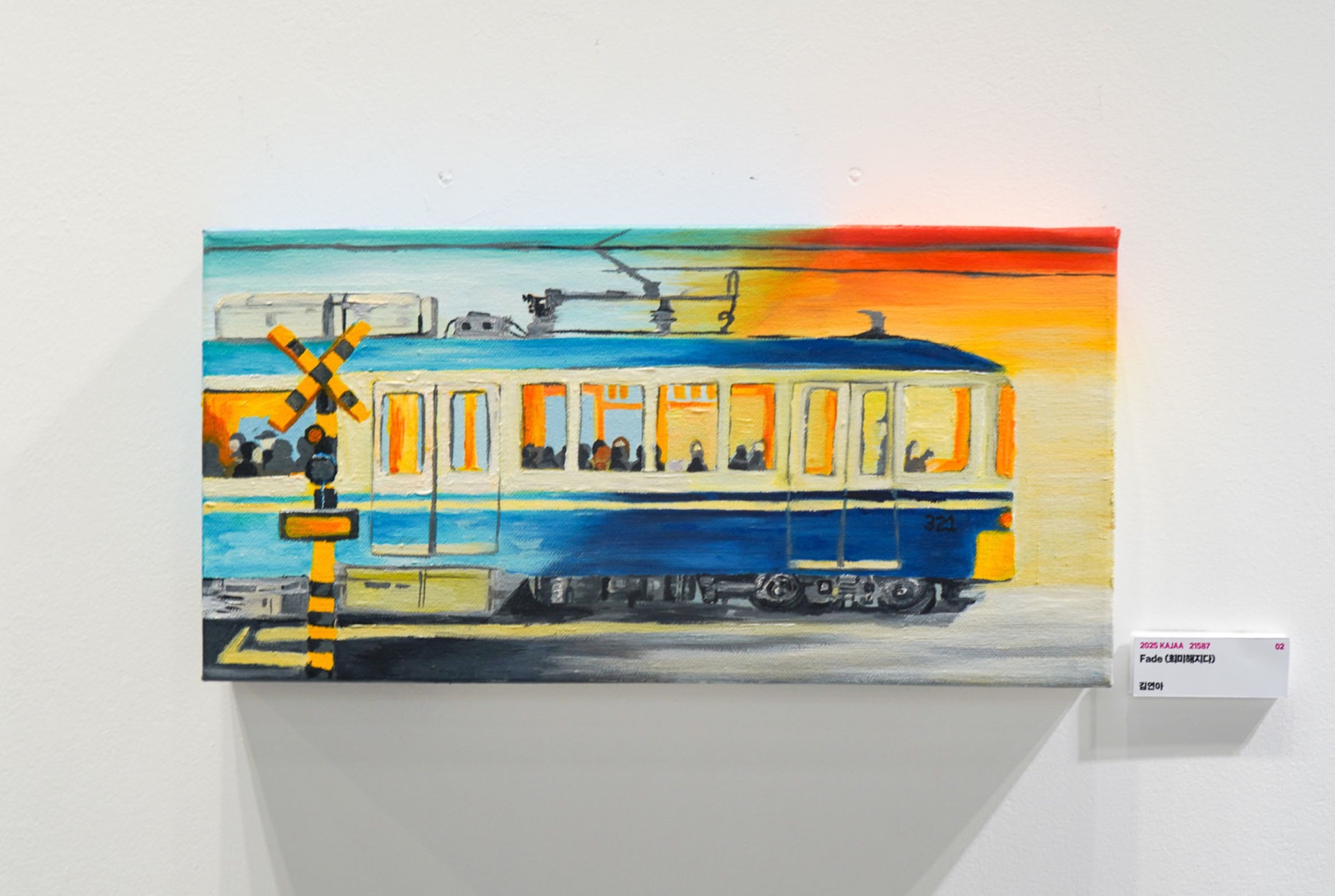 이 작품은 기차를 중심으로 과거와 현재를 담고 있다. 왼편에는 고요히 내리는 비와 푸른빛이 감도는 풍경, 그리고 그곳에는 되돌릴 수 없는 선택이 남긴 후회와 그리움이 마치 비가 내리며 느껴지는 습기처럼 깃들어 있다. 반면 오른편에는 그런 후회와 그리움을 잊고 살아가야만 하기에 다시 한발 한발 내딛는 다는 것을 서서히 떠오르는 해가 의미한다. 하지만 기차의 321라는 번호를 통해 아직까지도 마음 한 켠에는 후회와 그리움이 남아있다는 것을 알 수 있다. 기차는 그 경계 위에 있다. 우리는 슬픔과 그리움, 과거와 미래, 놓아야 할 것들과 붙잡아야 할 것들 사이에서 흔들리면서도 결국 나아간다. 그 여정 속에서, 우리는 매순간 자신에게 묻는다. 어디로 가는가, 어디에 머무를 것인가, 그리고 진정으로 ‘잊는다’는 것은 무엇인가?