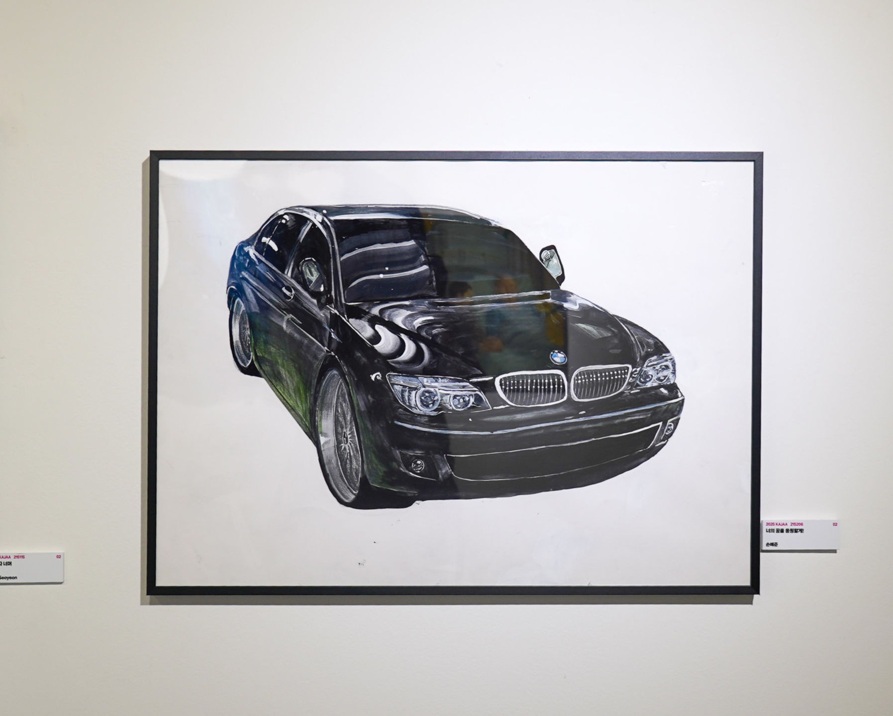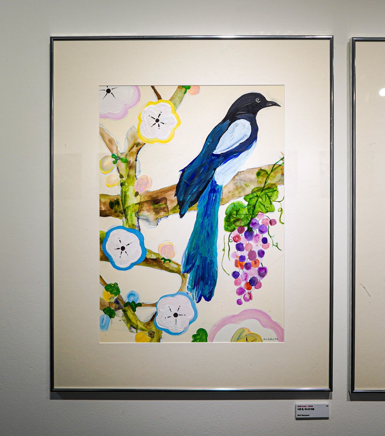 한 그루의 나무 위에 앉은 까치는 그 마음의 상징이에요. 한국에서는 복을 전하는 새이지만, 유럽에서는 불운이나 도둑의 상징으로 여겨지기도 해요. 하나의 존재가 서로 다른 의미를 가질 수 있다는 사실이 저에겐 다름의 아름다움처럼 느껴졌어요. 그 옆에 가득 열린 포도송이는, 작은 알갱이들이 모여 하나를 이루듯, 사람의 마음도 다양하게 모이면 풍요로워질 수 있다는 뜻을 담고 있어요. 그 사이엔 벚꽃이 피어 있어요. 짧고 화려하게 피었다 지는 벚꽃은 현대적 감성을 담고 있지만, 한국의 전통적인 자연과도 자연스럽게 어우러져요. 시대와 감성, 문화가 서로 다르더라도 함께 어울릴 수 있다는 걸 보여주고 싶었어요. 이 그림은 결국, 겉으로는 보이지 않아도 분명히 존재하는 마음들, 다름 속에서도 이어지는 조화와 연결을 이야기해요. 침묵 속에서도 마음은 흐르고, 그 마음은 색이 되고, 상징이 되고, 또 하나의 풍경이 되어 우리에게 다가와요. 이 모든 요소들이 모여, 보이지 않는 마음이 어떻게 조용히 전해질 수 있는지를 보여주고 싶었어요.