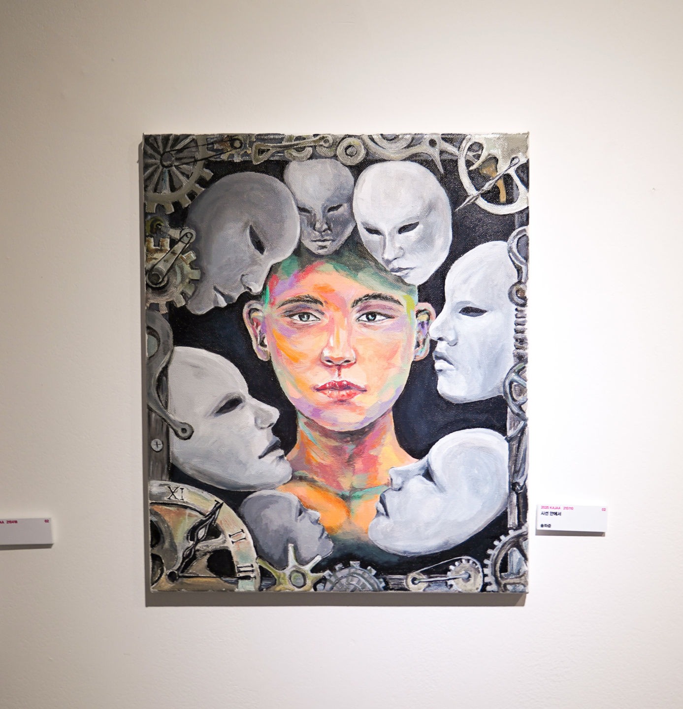 이 작품은 ‘보이지 않는 곳에서 전해진 마음’이라는 주제를, 현대 사회 속 청소년이 겪는 정체성의 상실과 심리적 억압이라는 현실적인 문제로 확장하여 표현한 시각적 은유입니다. 우리는 종종 명확한 언어가 아닌 분위기나 시선, 눈치와 같은 보이지 않는 요소들에 의해 통제받는 상황을 경험합니다. 이와 같은 무언의 압력은 사회 속에서 강력한 억제력으로 작용하며, 특히 정체성이 아직 완전히 형성되지 않은 청소년들에게 더 큰 영향을 끼칩니다. 작품 속에서 ‘색’은 개인의 고유함과 존재의 정체성을 상징합니다. 그리고 색을 가지고 있는 존재를 바라보는 회색 조의 가면들은 이미 그 고유성을 잃어버린 존재들이며, 모두 동일한 형상으로 그려져 개성이 제거된 상태를 나타냅니다. 또한 배경에 배치된 시계와 톱니바퀴는 이러한 억압이 단순한 개인의 경험이 아니라, 오랜 시간에 걸쳐 반복되고 구조화된 사회적 현실임을 암시하고 있습니다. 이들은 말없이 중심인물을 바라보며, 직접적인 언어나 행동 없이 시선만으로 압박을 가하는데, 이는 다수의 침묵과 집단적 시선이 만들어내는 심리적 억제를 상징합니다. 이 작품을 통해 단지 한 사람의 기억만을 조명하는 것이 아닌, 모든 이들이 한 번쯤 겪어 보았을 사회적 억압과 심리적 고통을 보여주는 시각적 기록을 보여주고자 했습니다.