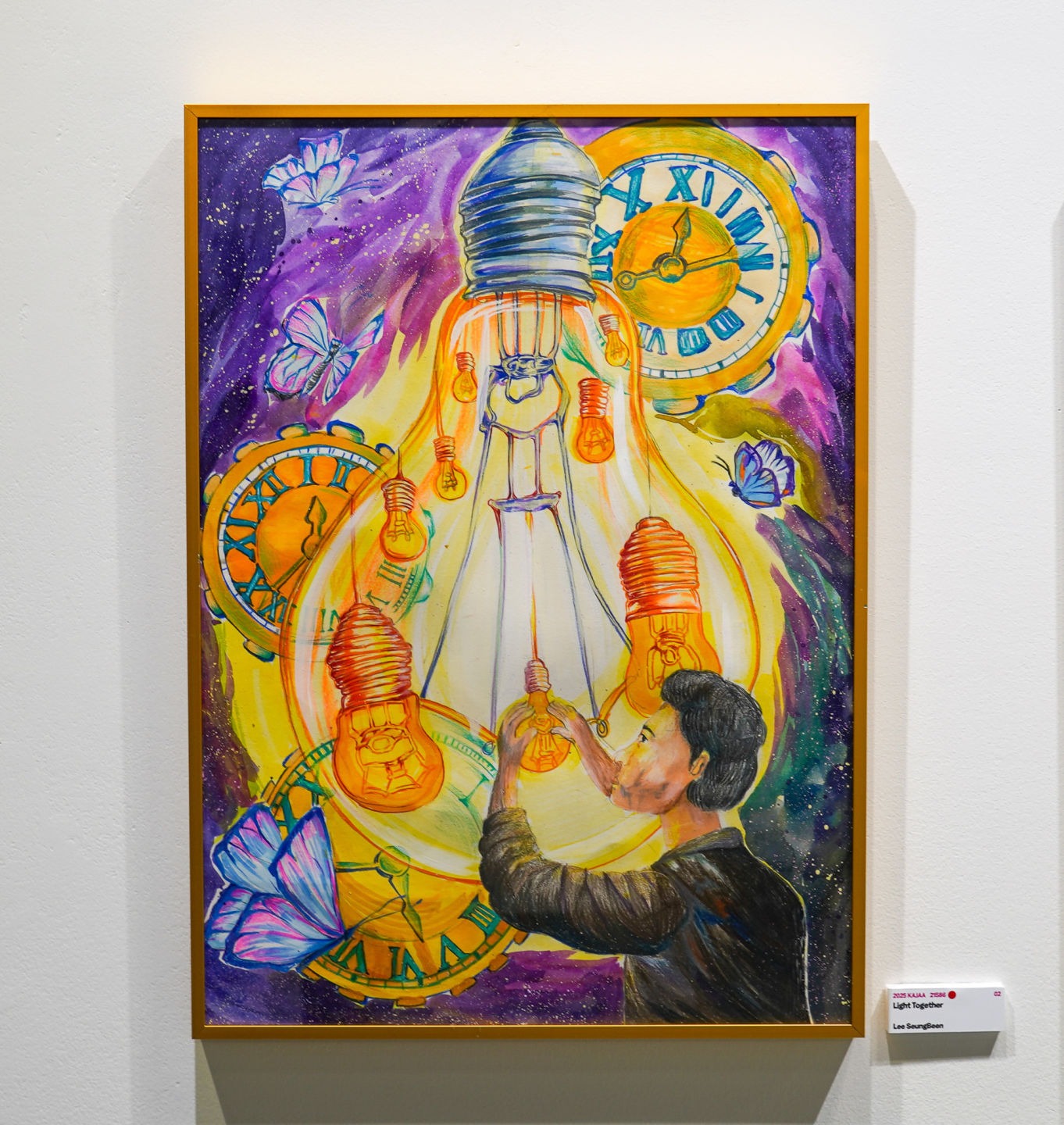 이 작품은 아무것도 보이지 않는 어두운 공간 속에서, 한 남성이 여러 개의 전구를 연결하고 조립하는 모습을 중심으로 구성되어 있습니다. 전구는 단순한 조명의 역할을 넘어서 사람들의 마음, 희망, 연결, 빛나는 가능성을 상징합니다. 전구 하나하나는 개별적으로는 작은 빛에 불과하지만, 함께 연결되고 조립됨으로써 하나의 큰 빛, 곧 공동의 희망을 만들어냅니다. 이 과정은 곧 협력과 공생을 의미합니다. 직접 보이지 않는 서로의 마음이 하나가 되고, 누군가를 향한 작은 배려와 응원이 어둠 같은 어려움을 이겨내면, 미흡한 작은 힘이 모여 새로운 미래를 밝히는 등불이 될 수 있습니다. 각각의 전구가 커다란 빛으로 하나가 되듯, 세계는 개개인이 아닌 공동의 미래를 향해 나아갈 때, 공생할 수 있습니다. 작품 속의 시계와 나비는 시간과 변화, 회복을 상징하며, 희망이 단시간에 완성되는 것이 아니듯, 긴 시간과 인내, 그리고 보이지 않는 노력들로 완성된다는 점을 강조합니다.