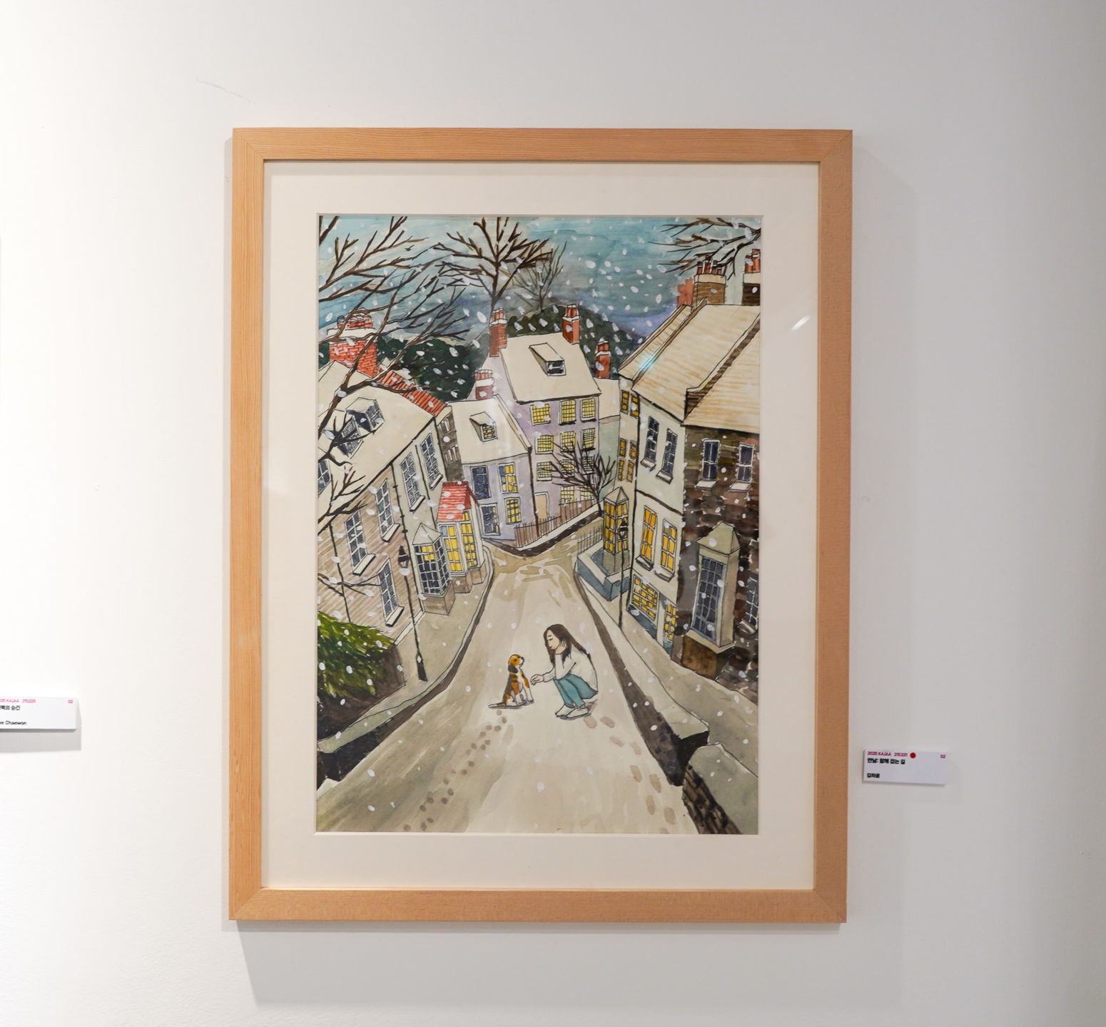 이 작품은 눈이 소복이 내리는 겨울날, 조용한 언덕 마을의 골목길을 배경으로 하고 있습니다. 좁은 길 위에서 한 소녀가 주인 없는 강아지를 발견하고, 따뜻한 손길을 내미는 순간을 포착했습니다. 각자 따로 걷던 두 존재는 마음에서 우러난 작고 따뜻한 행동을 통해 함께 걷는 존재가 됩니다. 고요한 거리, 노란 불빛이 은은하게 비치는 창문, 그리고 하늘에서 흩날리는 눈송이들은 포근하면서도 어딘가 쓸쓸한 감정을 자아냅니다. 눈 덮인 길 위에 남겨진 발자국은 이제 막 시작된 둘의 여정을 보여주며, 외로움 속에서도 피어나는 연결과 따뜻한 관계를 상징합니다. 이 그림에는 제 마음이 담겨 있습니다. 서로를 향해 손을 내밀고 마음을 열었을 때, 우리는 함께할 수 있다는 믿음. 인간과 동물 사이의 유대, 그리고 그 유대가 만들어내는 조용하고 평화로운 순간을 담고자 했습니다.