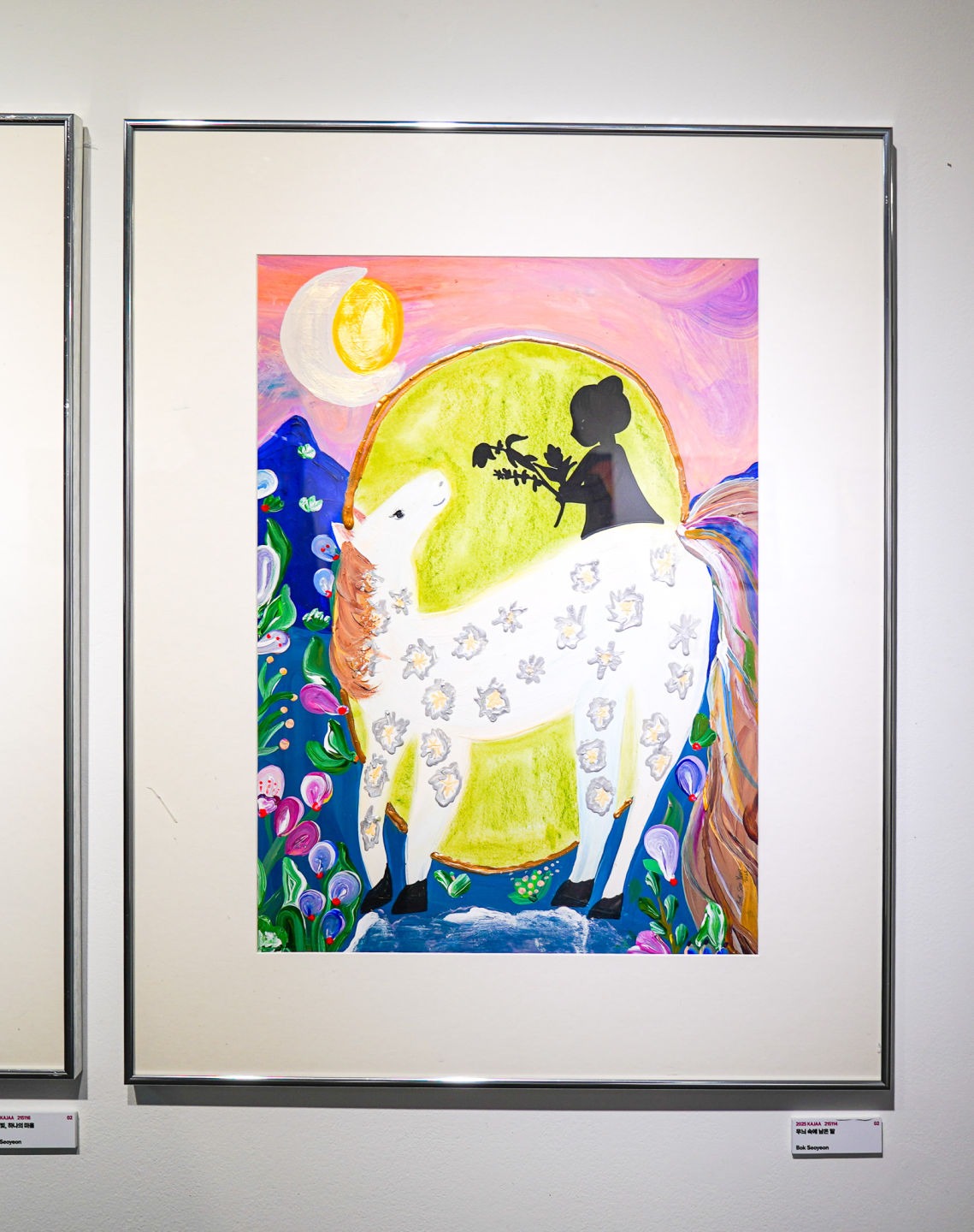 이 그림은 보이지 않아도, 말하지 않아도 진심은 전해질 수 있다는 믿음에서 시작됐어요. 말을 타고 있는 사람은 검은 실루엣으로 표현했지만, 손에 들린 꽃 한 송이만으로도 전하고 싶은 마음이 느껴졌으면 좋겠다고 생각했어요. 그 마음은 말이라는 존재를 통해 조용히, 그러나 분명하게 누군가에게 향하고 있어요. 흰 말은 단순한 동물이 아니라, 눈에 보이지 않는 마음을 대신 전하는 존재예요. 말의 몸에 새겨진 무늬는 장식이 아니라, 전해진 감정과 기억, 그리고 마음의 결을 담고 있어요. 말이 지나온 시간과 그 마음들이 어떻게 스며들고 남았는지를 보여주는 흔적처럼요. 하늘 위에 떠 있는 초승달과 저물어가는 풍경, 그리고 주변을 감싸는 자연의 색감은 말과 인물, 그리고 마음이 함께 흘러가는 조용한 여정을 표현하고 있어요. 이 장면은 누군가와 직접 마주하지 않아도, 마음이 마음에게 닿을 수 있다는 것을 보여주고 싶었어요. 우리가 살면서 종종 느끼는, 설명되지 않아도 전해지는 감정들, 그 조용하고 깊은 흐름을 이 그림 속에 담아내고 싶었어요.